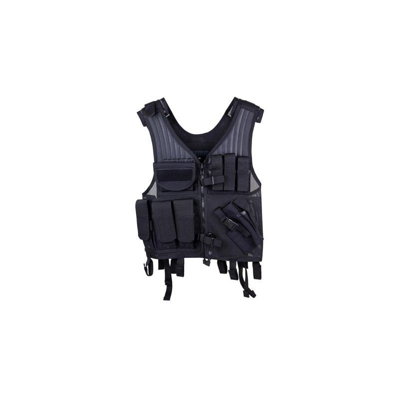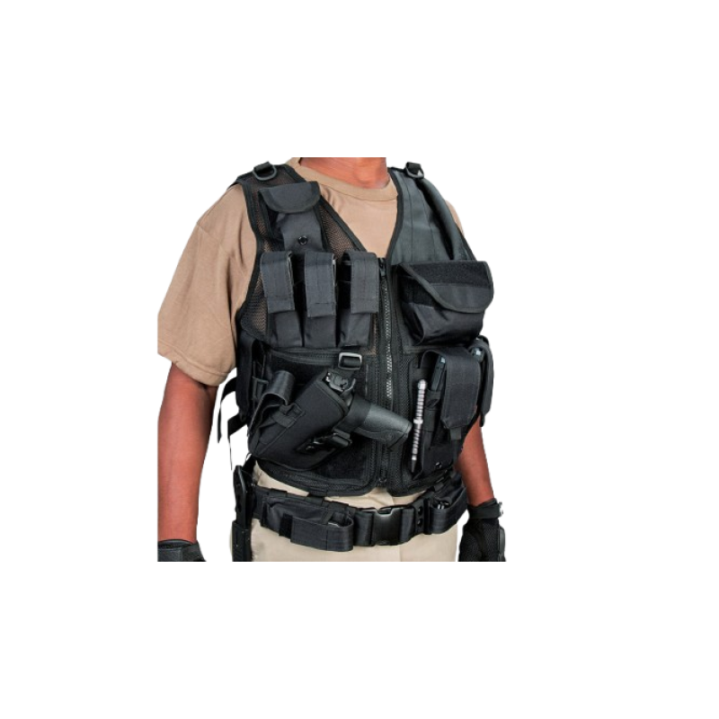 Specifications | Material: Breathable nylon mesh Adjustment: Up to 6″ length / 32″ girth Storage: Internal zip pockets + mag pouches Extras: Cross-draw holster |